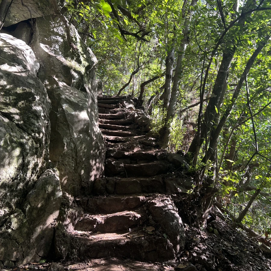 Am Informationszentrum geht es ohne Schonfrist direkt los ! Der Aufstieg zum MIRADOR DE LAS BARANDAS hat es in sich - 250 Höhenmeter - 500 Stufen - und das auf einer relativ kurzen Strecke von 1,4 Kilometern. (Coverfoto) Da kommt man schnell auf Betriebstemperatur. Zu dieser Tageszeit liegt der Weg erfreulicherweise komplett im Schatten.